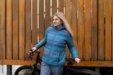Bike rental concept. Blond woman walking with a bicycle on a day off