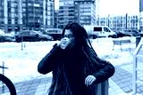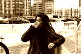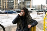 Lifestyle concept, young European woman with informal dreadlocks hairstyle drinks coffee while walking around the city in winter