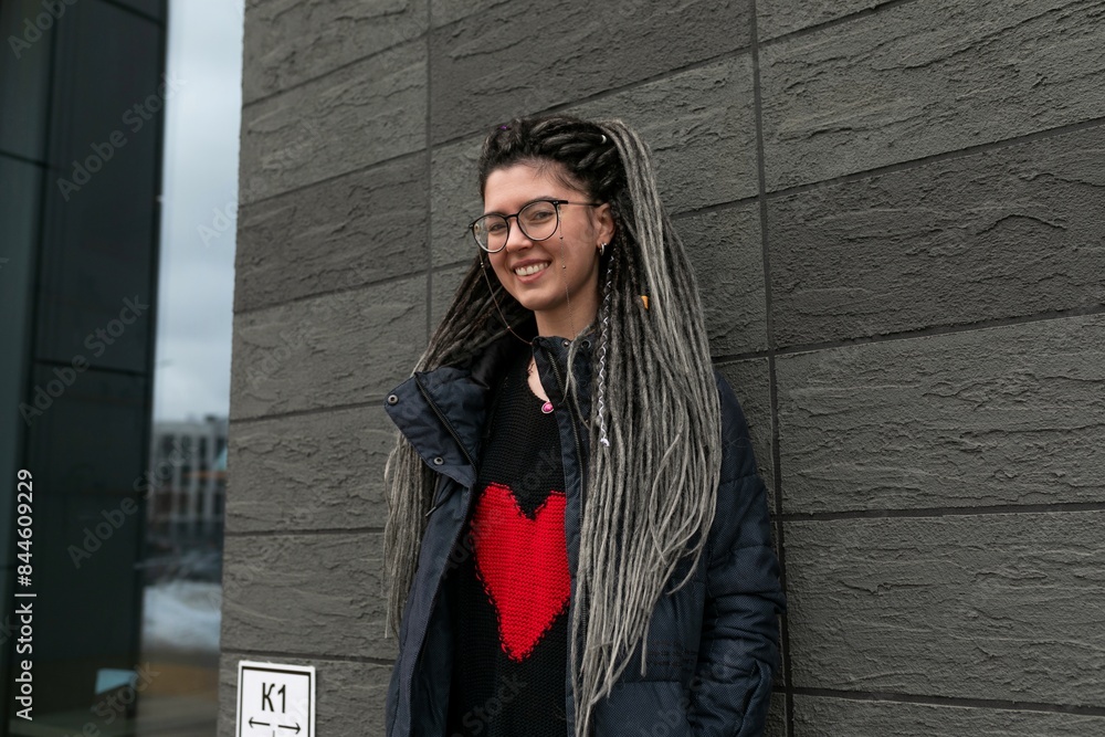 Urban charming woman with dreadlocks hairstyle looks informal and unusual
