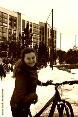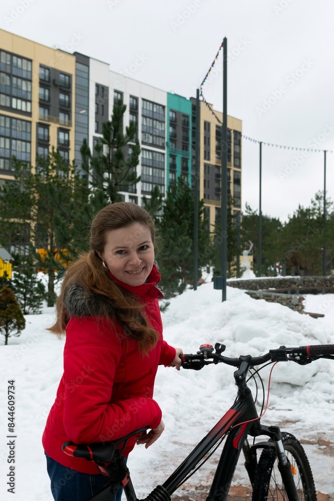 Cute young woman in a winter jacket riding a bicycle