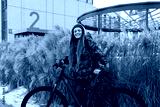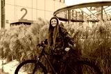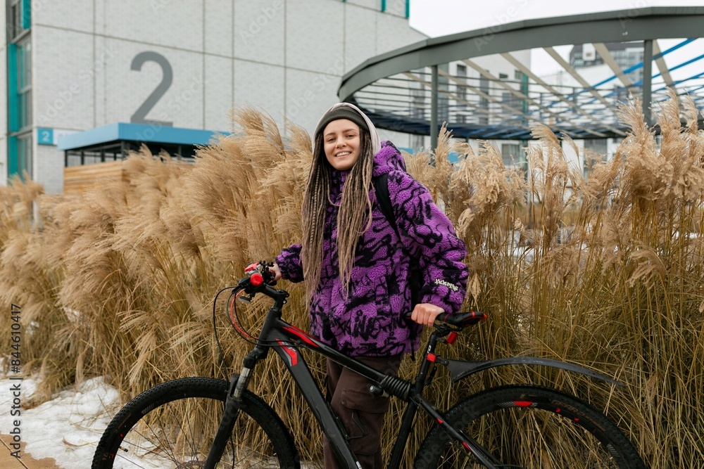 European stylish woman in an informal look with dreadlocks and piercings moves around the city on a bicycle