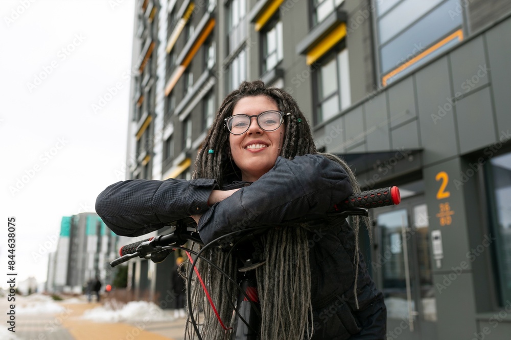 Cute young woman with dreadlocks hairstyle and bicycle in an urban environment
