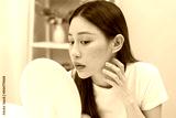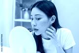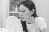 Dermatology, expression face worry asian young woman looking mirror hand touch face at dark spot of melasma, freckle from pigment melanin, allergy sun. Beauty care, skin problem treatment, acne care.