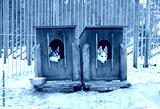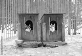 Husky dog in a wooden kennel in the snow, Lapland, Finland