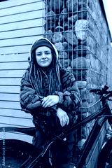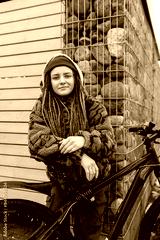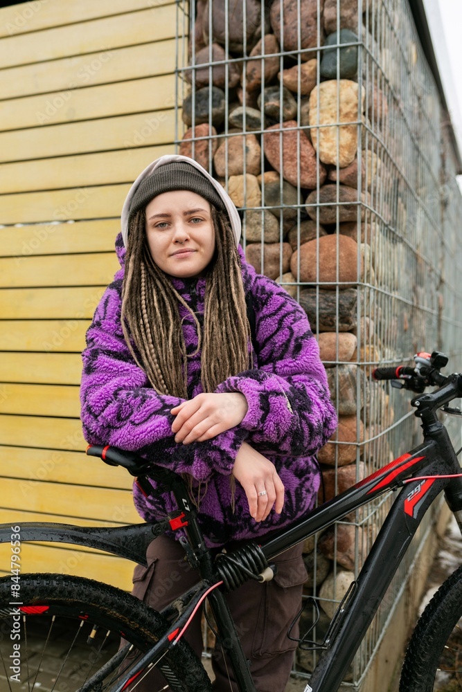 European stylish woman in an informal look with dreadlocks and piercings moves around the city on a bicycle