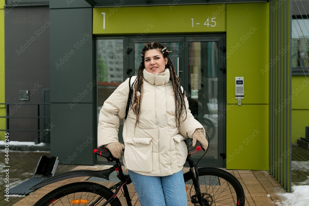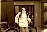 Woman Standing Next to Bike in Front of Building