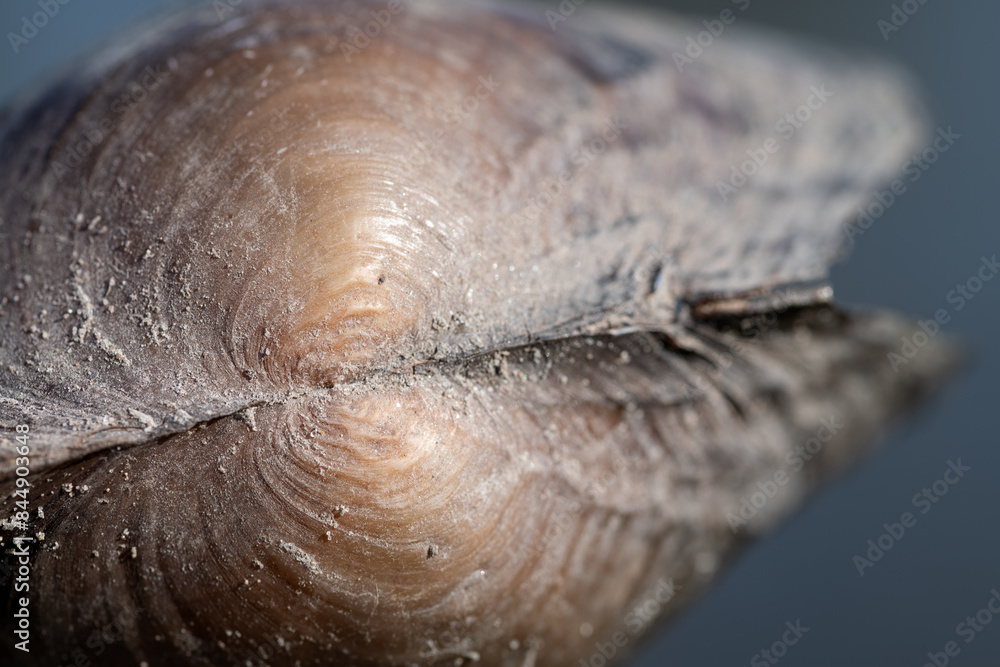 Close-up and texture of the shell of a common river mussel (unio crassus), a large mussel that lives in flowing fresh water. There are grains of sand on the shell.
