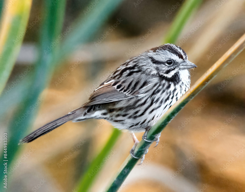 Song Sparrow perching on low shrub. Palo Alto Baylands, Santa Clara County, California.