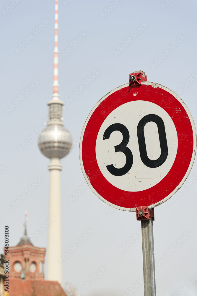 Verkehrsschild mit der Geschwindigkeitsbegrenzung Tempo 30 in Berlin mit dem Fernsehturm im Hintergrund