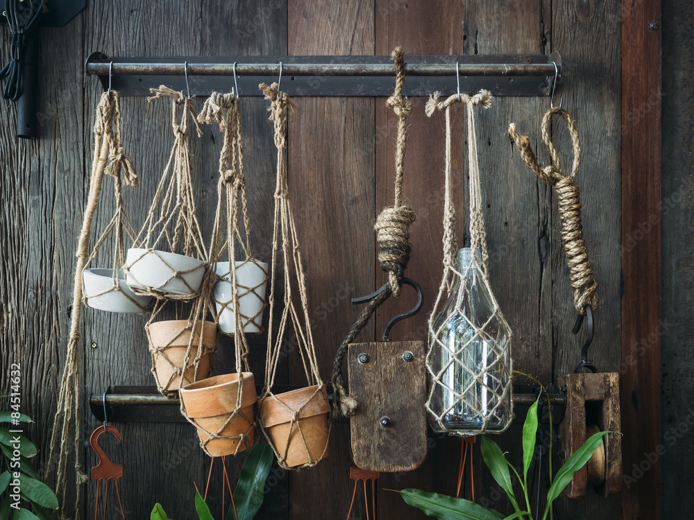 Plant pot decoration displayed on wooden wall Gardening concept