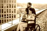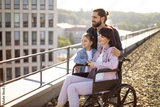 Concept of leisure, support and disability. Bearded Caucasian dad, little cute daughter and young mother in wheelchair watching at sunset on roof of modern house.