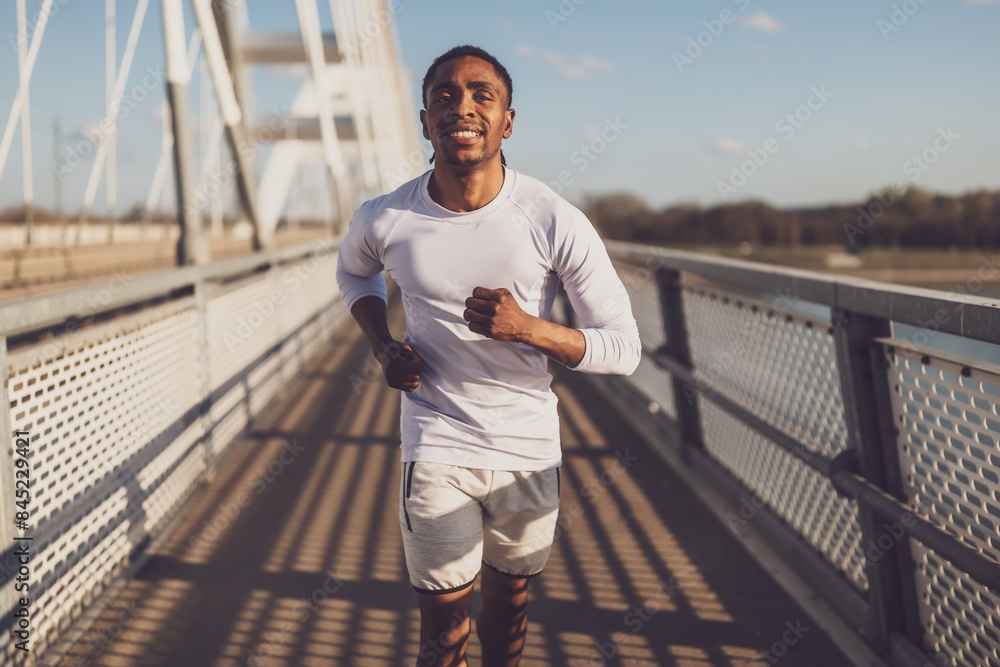 Young african-american man is jogging on the bridge in the city.