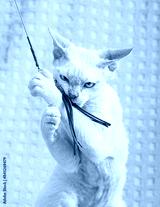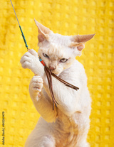 White Devon Rex Kitten Kitty Playing With Feather Toy. Short-haired Cat Of English Breed On Yellow Plaid Background. Shorthair Pet Cat