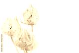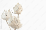 Dried beige fragile closed flowers with branches on light background and place for text macro