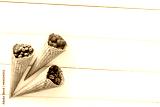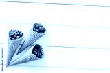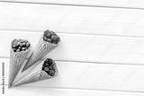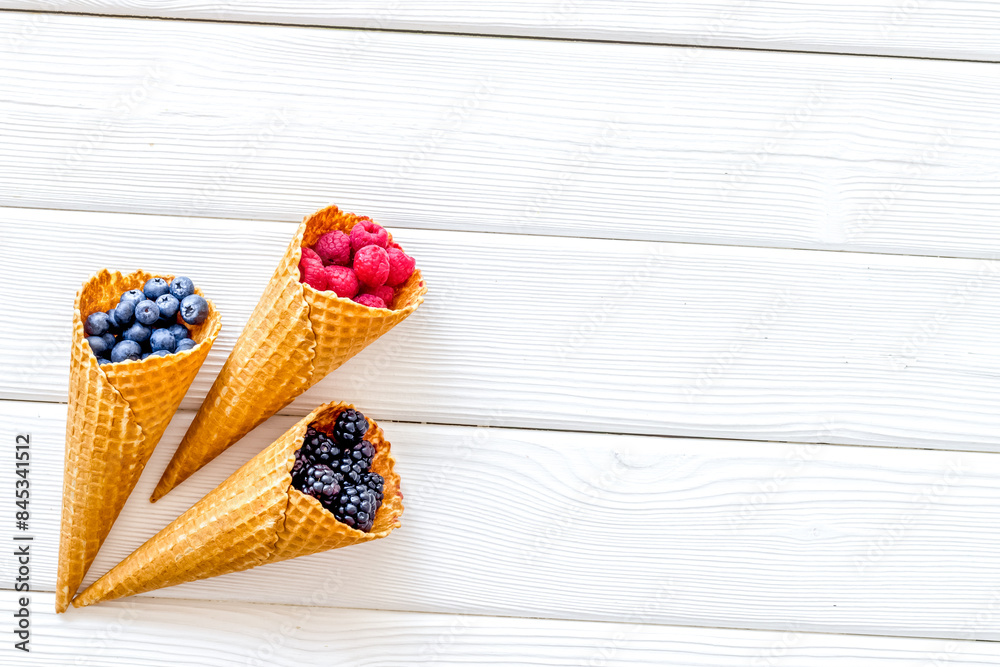 Summer breakfast with fresh berries in waffle cones on white woo