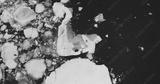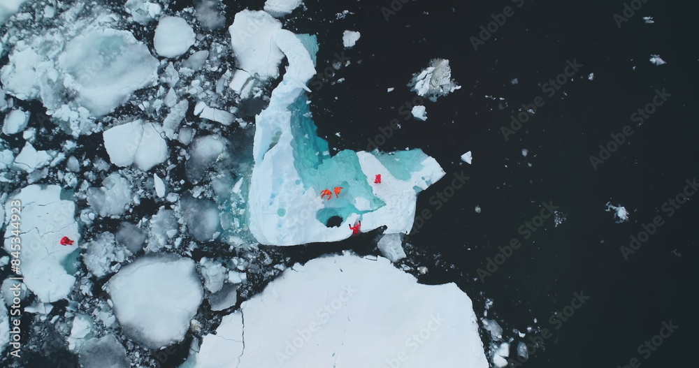 People swimming arctic ice ocean aerial view. Scientists explore global warming issue in Antarctica. Group of man in orange wetsuits take samples and measure melting glacier water, climate change