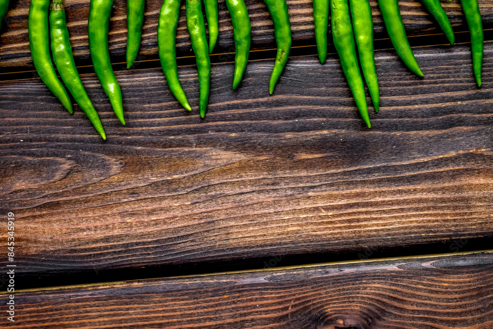 Fresh green chilli pepper as food ingredient on wooden table background top view mockup