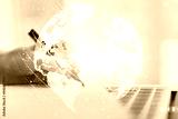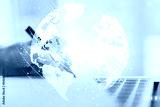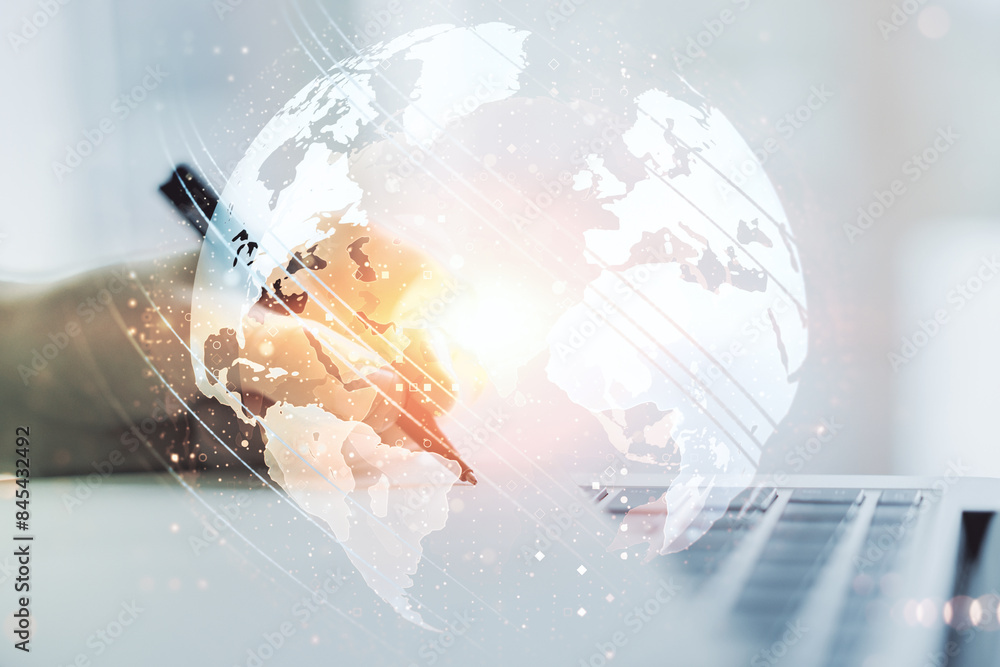 Multi exposure of abstract graphic world map and hand writing in notepad on background with laptop, connection and communication concept