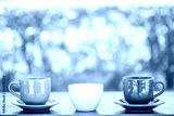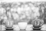 Three cup coffee on wooden and nature background