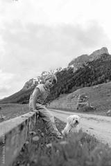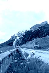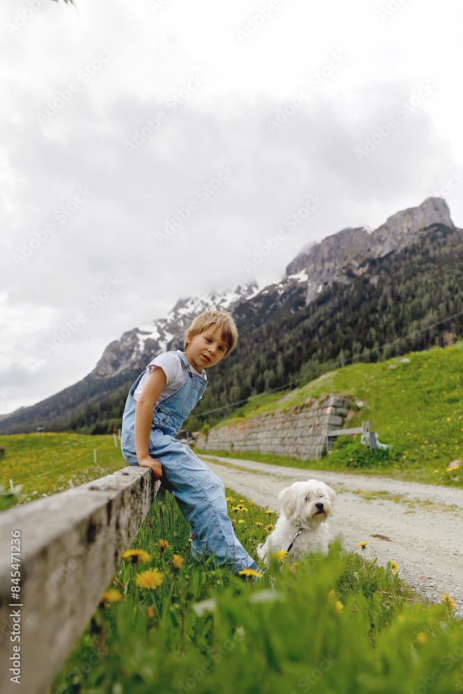 Children, boy brothers in Switzerlands Alps on a spring day with pet maltese dog, traveling.