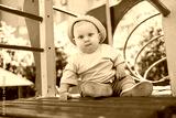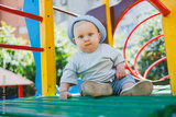 A blond-haired boy with blue eyes, an infant of 11 months, plays outside on the playground. A child in summer clothes.