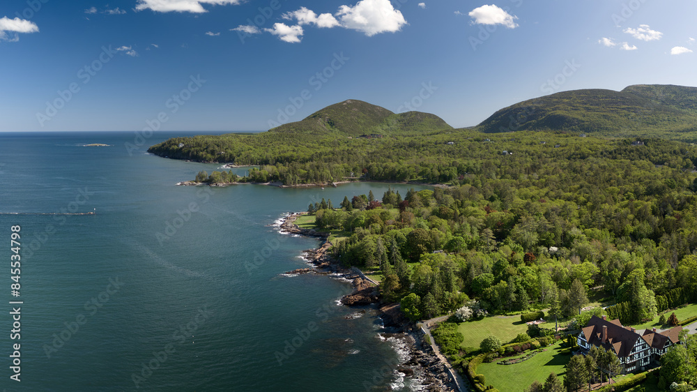Aerial panoramic view of Bar Harbor, Maine, USA. May 29, 2024.