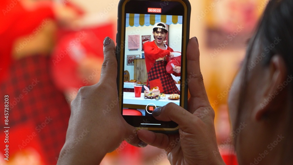 Customer record video of restaurant worker dancing and holding food tray at modern bar with food. Male asian waitress with napkin preparing food order while customer hands holding camera. Regalement.