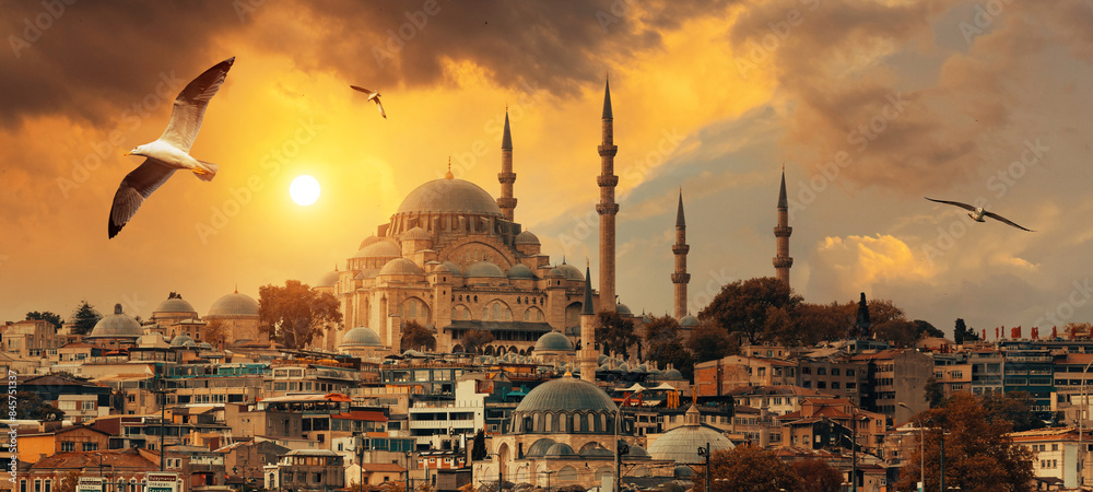 Beautiful view of gorgeous historical Suleymaniye Mosque, Rustem Pasa Mosque and buildings in front of dramatic sunset. Istanbul most popular tourism destination of Turkey. Travel Turkey concept.