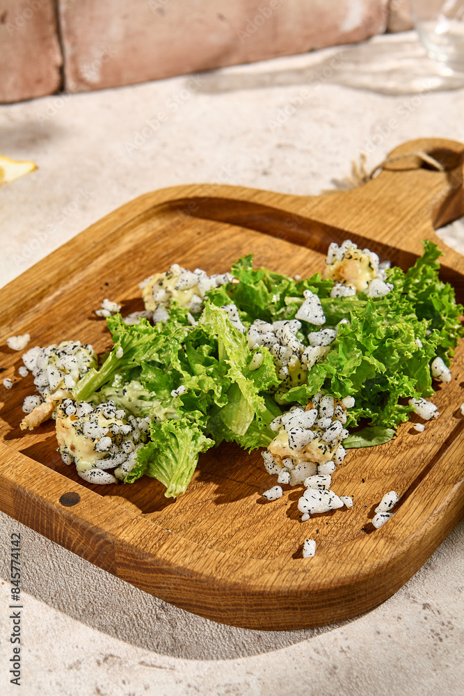 Natural Airy Broccoli Salad on Rustic Wooden Cutting Board in Sunlight