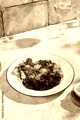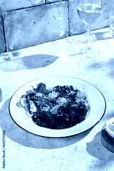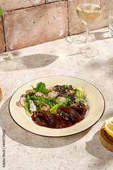 Beef Cheeks with Mixed Salad and Mushrooms in Natural Light Still Life
