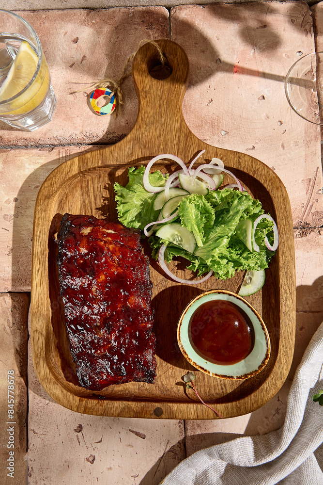 BBQ Ribs with Sauce and Green Salad in Sunlit Rustic Setting - Authentic Still Life
