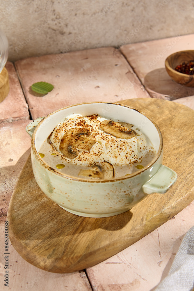 Authentic Mushroom Cream Soup with Whipped Cream Mousseline – Natural Sunlit Still Life Aesthetic