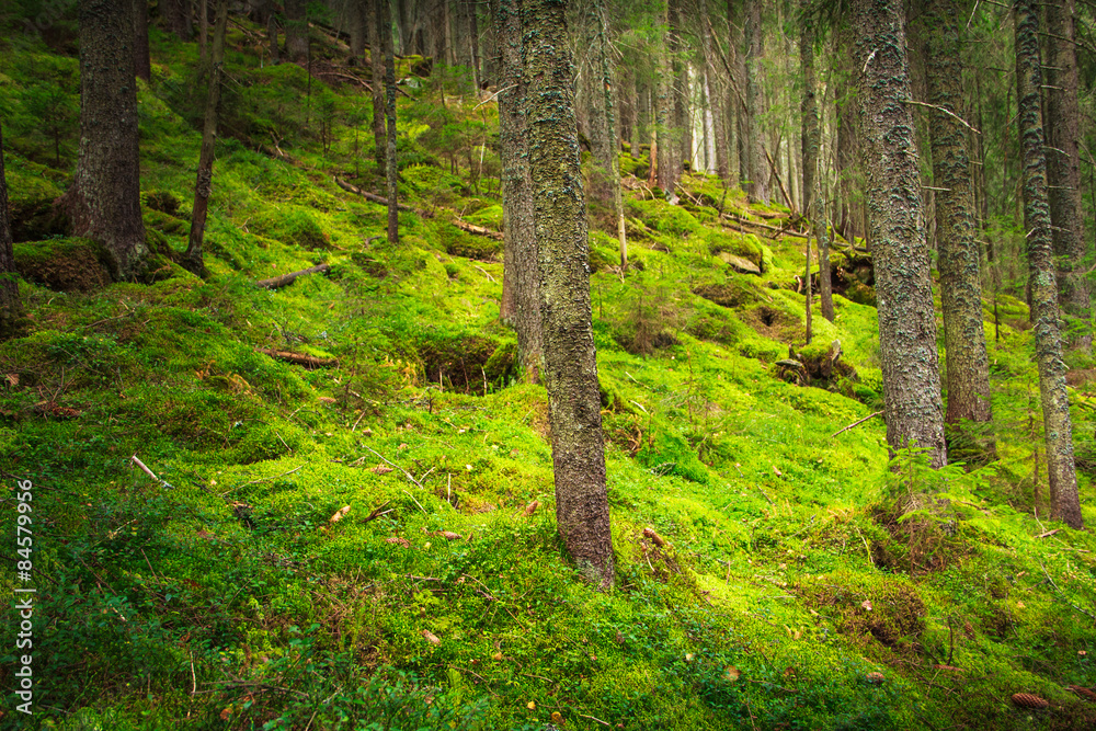Landscape dense mountain forest and the ground is covered with moss.