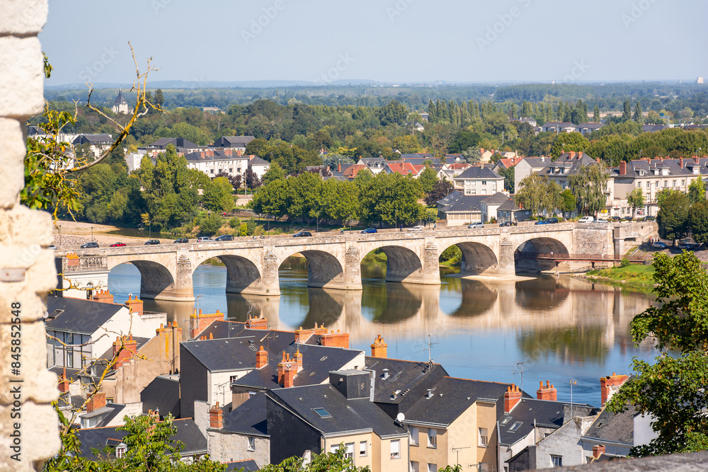 Aerial view of bridge in Saumur in Loire valley in France reflected to Loire river waters
