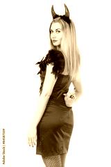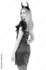 Beautiful young woman in a devil costume showing a fuck sign beh