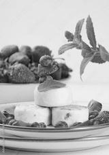 Stack of four cheesecakes on a plate with berries, blueberries, strawberries and cherries. Background white