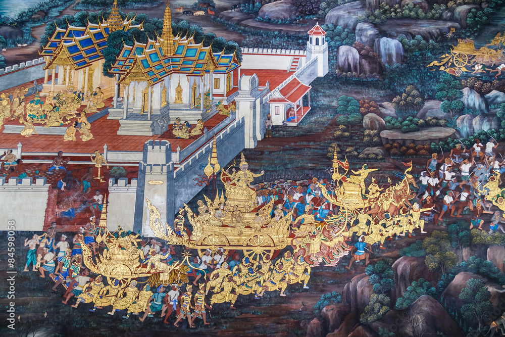 Mural paintings along at Wat Phra Kaew in Bangkok, Thailand