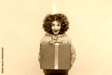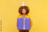 Portrait of surprised woman in party cone with Afro hairstyle congratulation with birthday, holding big present box, wearing casual style hoodie. Indoor studio shot isolated on yellow background.