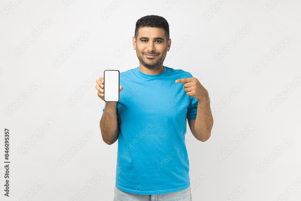 Portrait of pleased friendly cute unshaven man wearing blue T- shirt standing pointing at empty display of smart phone, looking at camera. Indoor studio shot isolated on gray background.