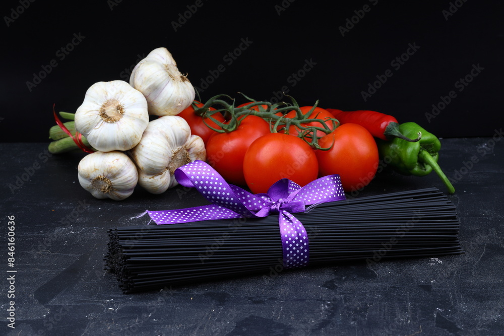 Raw black homemade spaghetti bunch isolated. Dry black noodles macaroni bundle. Close-up