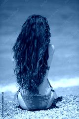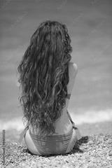 Long hair. Outdoor brunette girl portrait in bikini resting by t