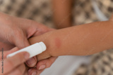 mother applying antiallergic cream on red spot at baby arm after red bite of mosquito