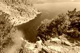 Girl traveler in a hat looks from a cliff at the Oludeniz Butterfly Valley, traveling to Turkey