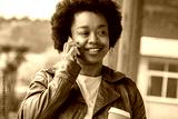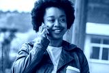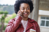 African American woman talking on phone and holding cup of coffee on the street