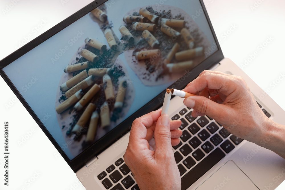 World No Tobacco Day. An adult Caucasian man looking at photos on the laptop of the negative effects of smoking, decides to quit smoking by breaking a cigarette in half