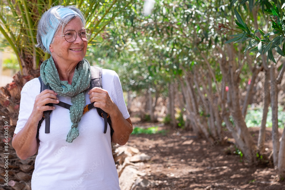 Carefree senior smiling woman with backpack walking in outdoor activity enjoying healthy lifestyle and freedom. Beautiful elderly woman in a park path