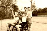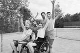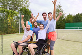 Inclusive tennis team celebrates victory on court with people using wheelchair