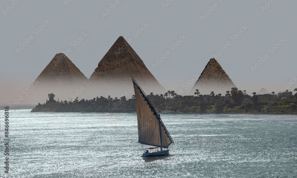 Beautiful Nile scenery with traditional Felluca sailing boat in the Nile on the way to Giza pyramids at amazing sunset - Cairo, Egypt