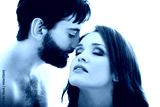 Shirtless man whispering to woman's ear.