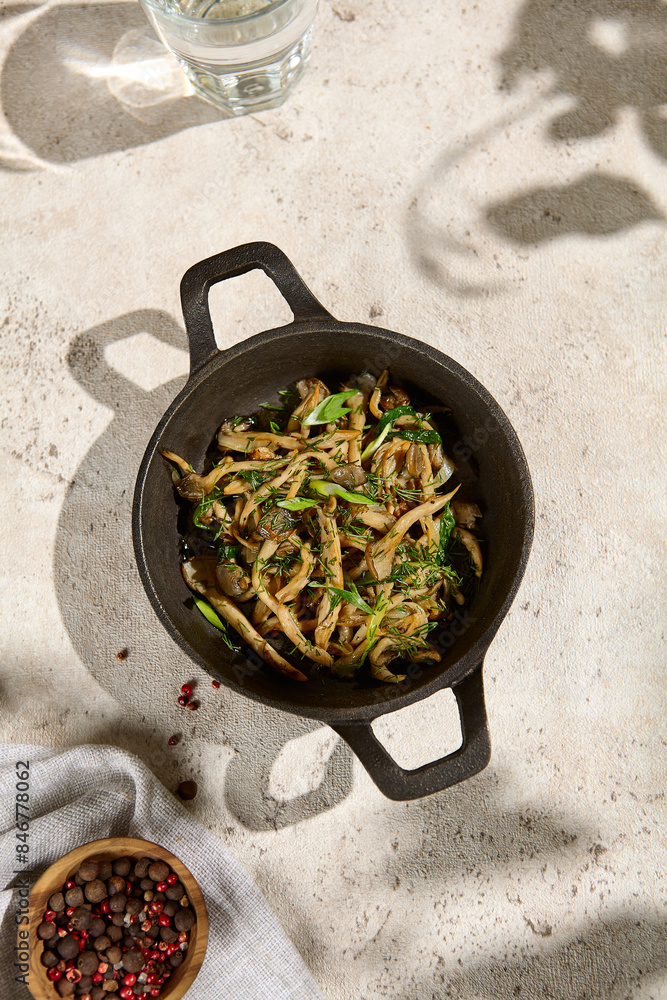 Sunlit Sautéed Oyster Mushrooms with Fresh Herbs in Summer Light and Shadows